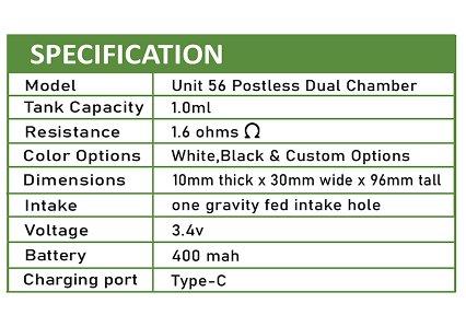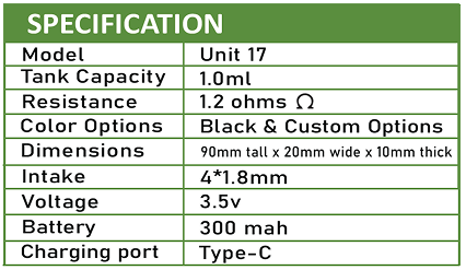 The Unit 17 Disposable combines sleek, discreet de-sign with reliable performance, delivering exceptional vapor quality across a wide range of oil viscosities.