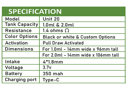 The Unit 20 Disposable, available in 1g and 2g options, features a full zirconia construction, pull-draw activation, and low-heat technology to deliver unmatched durability, purity, and exceptional flavor preservation.