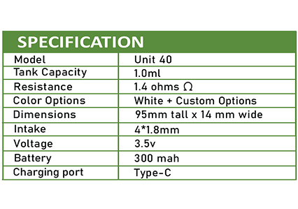 The Unit 40 Disposable, features full zirconia construction, pull-draw activation, and low-heat technology, delivering exceptional durability, purity, and superior flavor preservation.
