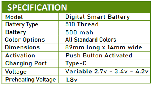This digital smart battery is a sleek 510 thread device featuring variable voltage control for a personalized vaping experience. Its compact design and user-friendly interface make it a solid choice for both new and seasoned users. Compatible with all standard 510 cartridges, the device and packaging are fully customizable—perfect for bringing your brand to life with a modern, reliable platform.