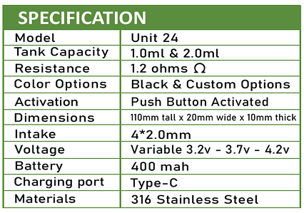 The Unit 24 Disposable features a sleek design, push-button activation, versatile compatibility, and variable voltage settings, delivering a customizable and reliable vaping experience.