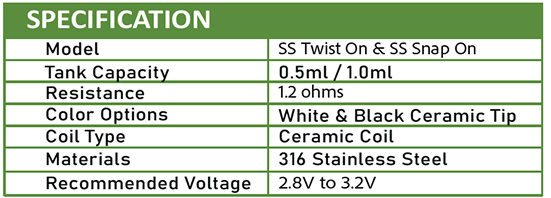 Offered in both twist-on and snap-on styles, these cartridges provide flexibility in assembly. The snap-on closure streamlines the capping process while delivering a premium look. Each unit features a ceramic tip, glass tank, and 316 stainless steel components—a medical-grade, lead-free device that ensures high quality standards.