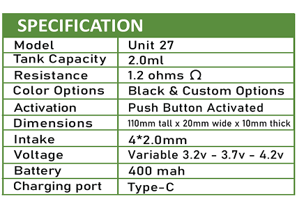 The Unit 27 Disposable combines sleek design, push-button activation, a digital screen display, and variable voltage settings to deliver a precise, customizable, and reliable vaping experience.