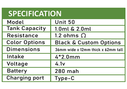 The Unit 50 Disposable, available in both 1g and 2g options, features a sleek design, pull-draw activation, versatile oil compatibility, and low-heat technology for exceptional flavor preservation and reliable performance.